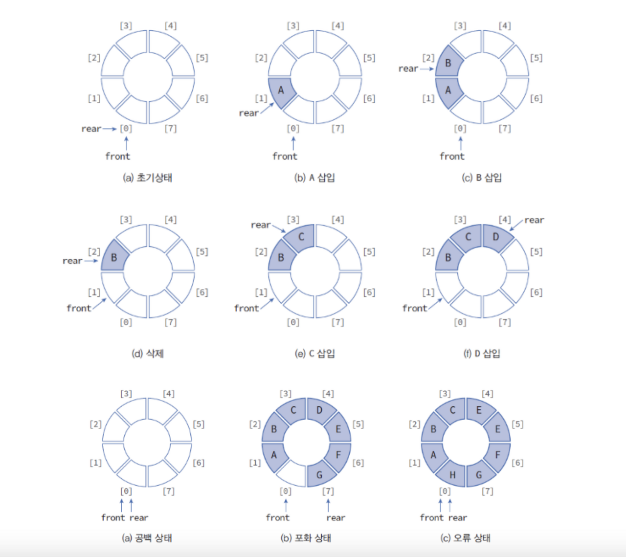 그림에서 볼 수 있듯이 공백 상태와 포화 상태를 구분하기 위해 하나의 공간을 비워두었으며, front == rear인 경우에 원형 큐는 Empty이고, front == (rear+1) % MAX_QUEUE_SIZE인 경우에는 포화 상태인 것이다.