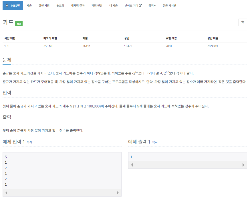 준규는 숫자 카드 N장을 가지고 있다. 숫자 카드에는 정수가 하나 적혀있는데, 적혀있는 수는 -262보다 크거나 같고, 262보다 작거나 같다. 준규가 가지고 있는 카드가 주어졌을 때, 가장 많이 가지
