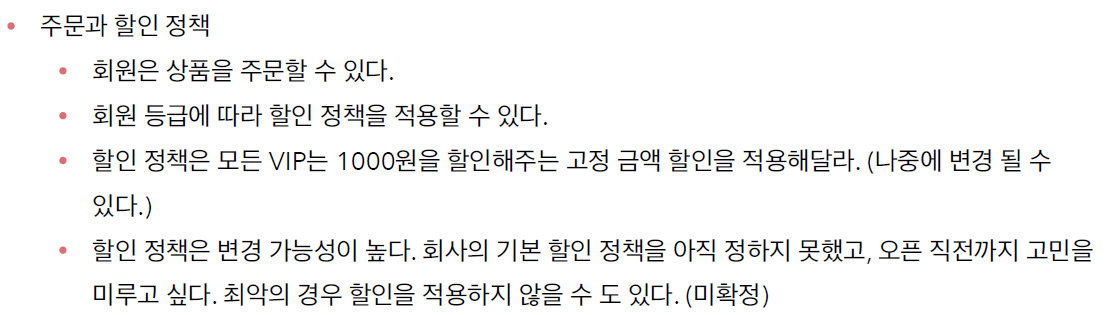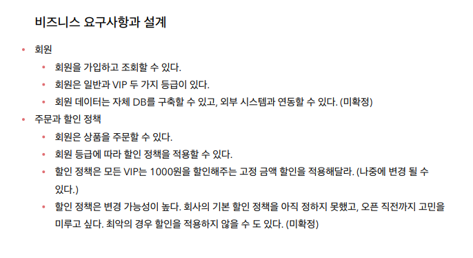요구사항을 보면 회원 데이터, 할인 정책 같은 부분은 지금 결정하기 어려운 부분이다. 오픈 일정은 정해져 있기 때문에 그렇다고 이런 정책이 결정될 때까지 개발을 무기한 기다릴 수 없다. 앞에서 배운 객체 지향 설계 방법을 사용하여 인터페이스를 만들고 구현체를 언제든지 갈아 끼울 수 있도록 설계하면 된다.