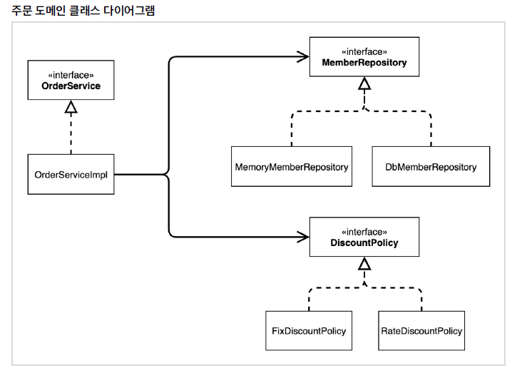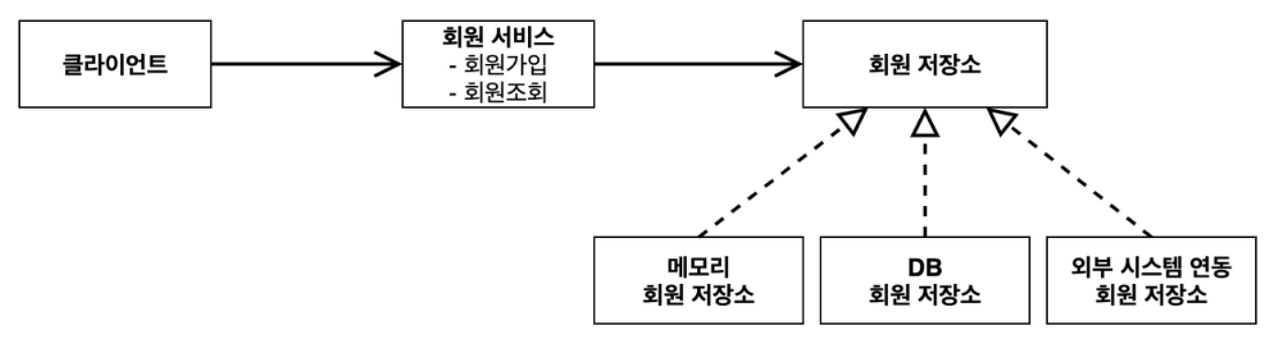 회원을 메모리가 아닌 실제 DB에서 조회하고, 정률 할인 정책(주문금액에 따른 % 할인)을 지원해도 주문 서비스를 변경하지 않아도 된다.