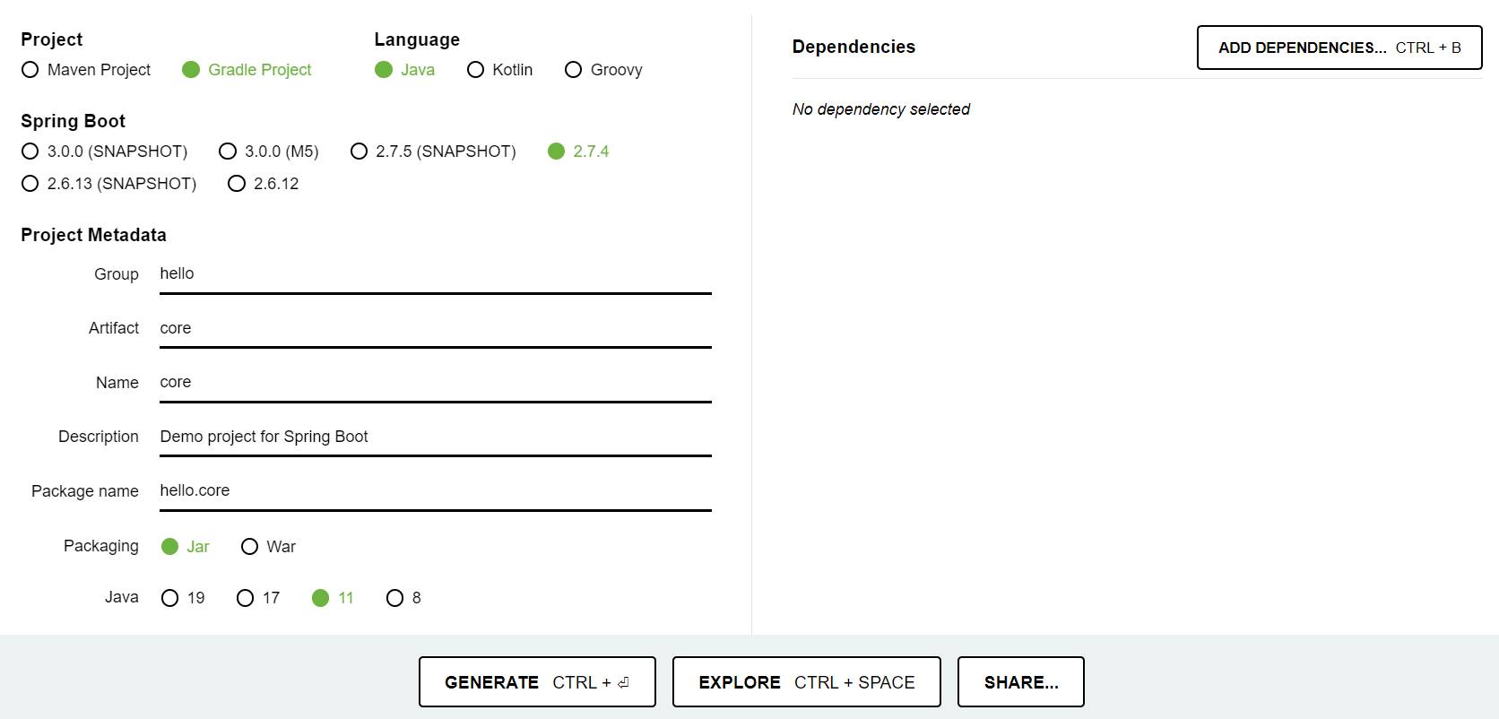 여기서는 순수 자바의 역량을 보여주기 위해서 어떠한 외부 Dependecies도 추가하지 않고 진행하였다.