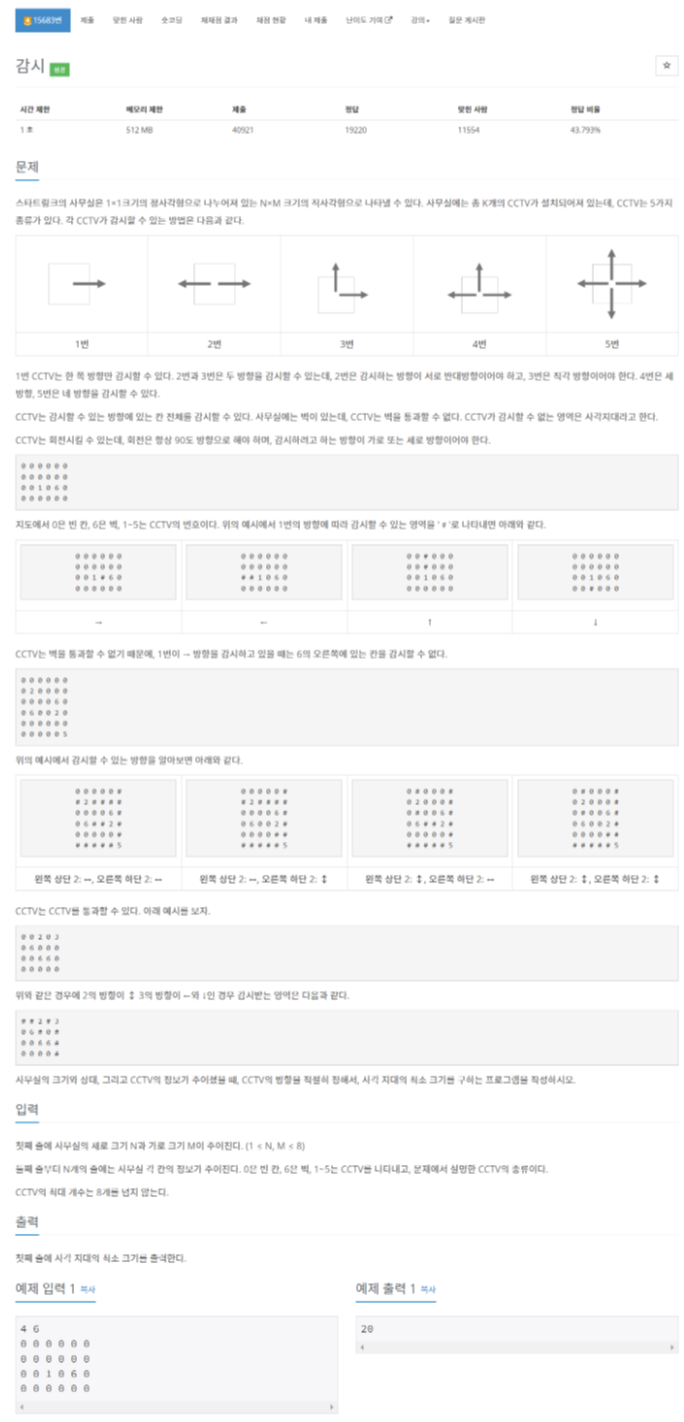 스타트링크의 사무실은 1×1크기의 정사각형으로 나누어져 있는 N×M 크기의 직사각형으로 나타낼 수 있다. 사무실에는 총 K개의 CCTV가 설치되어져 있는데, CCTV는 5가지 종류가 있다. 각 CCTV가 감