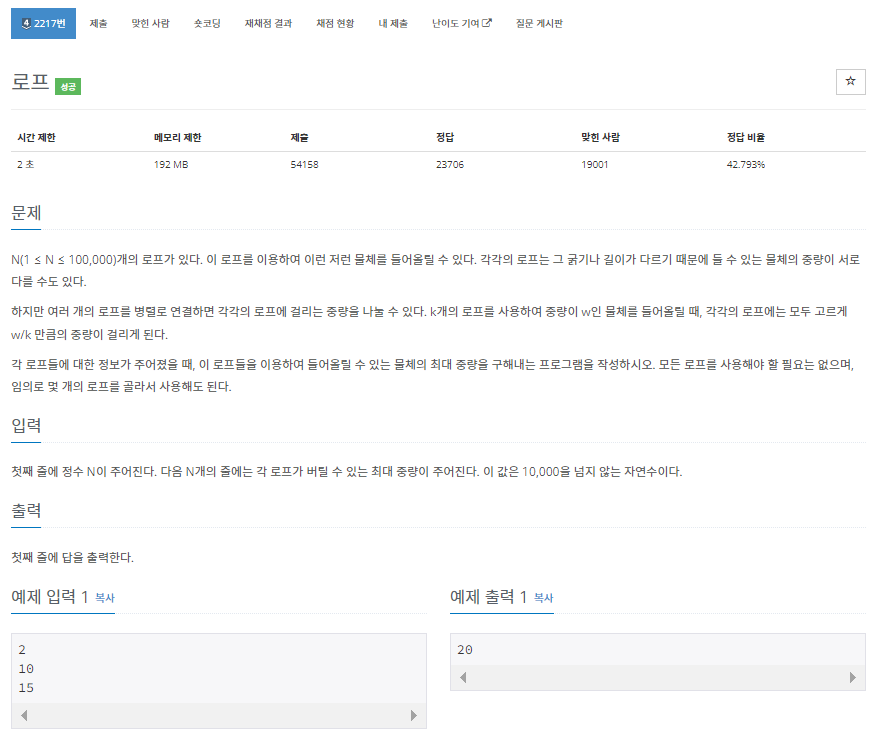N(1 ≤ N ≤ 100,000)개의 로프가 있다. 이 로프를 이용하여 이런 저런 물체를 들어올릴 수 있다. 각각의 로프는 그 굵기나 길이가 다르기 때문에 들 수 있는 물체의 중량이 서로 다를 수도 있다. 하