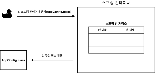 스프링 컨테이너는 파라미터로 넘어온 설정 클래스(AppConfig.class) 정보를 사용해서 스프링 빈들을 등록한다.