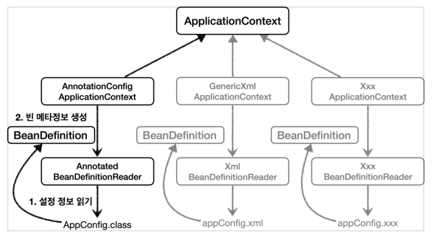 AnnotationConfigApplicationContext는 AnnotatedBeanDefinitionReader를 사용해서 AppConfig.class를 읽고 BeanDefinition을 생성한다.