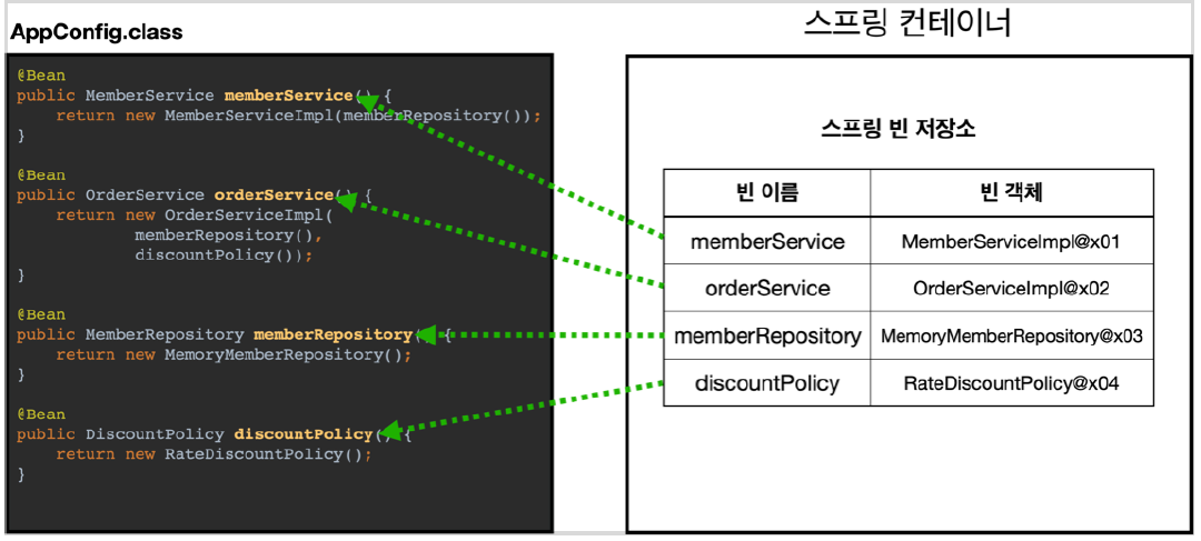 ※ 스프링은 빈을 생성하고, 의존관계를 주입하는 단계가 나누어져 있다. 그런데 이렇게 자바 코드로 스프링 빈을 등록하면 생성자를 호출하면서 의존관계 주입도 한 번에 처리된다. 여기서는 이해를 돕기 위해 개념적으로 나누어 설명했다. 자세한 내용은 의존관계 자동 주입에서 설명하겠다.