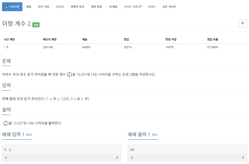 문제 링크 : https://www.acmicpc.net/problem/11051