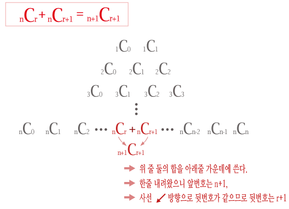이항 계수의 성질 중 다음의 파스칼의 삼각형을 사용하여 풀었다.