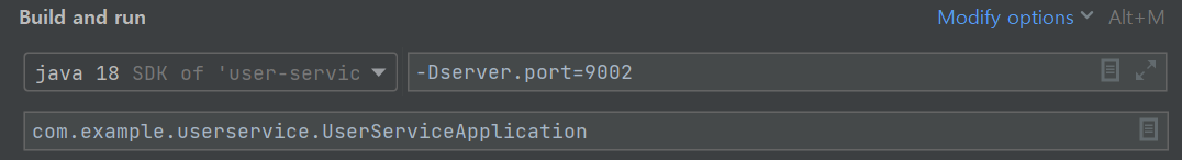 Modify options에서 Add VM options 선택하여 다음과 같이 추가하면 UserServiceApplication-2가 9002 포트에서 실행되게 설정할 수 있다.