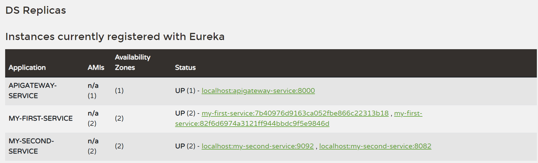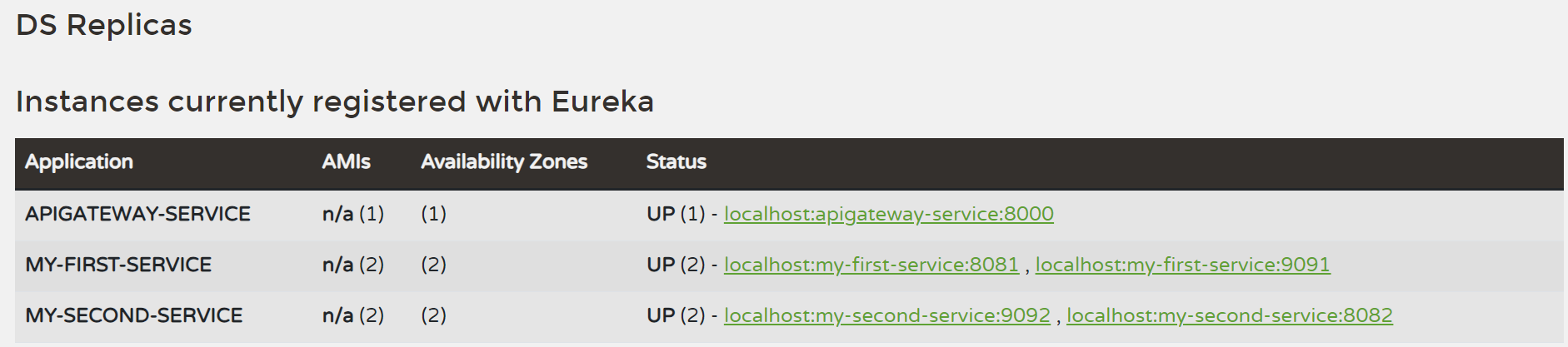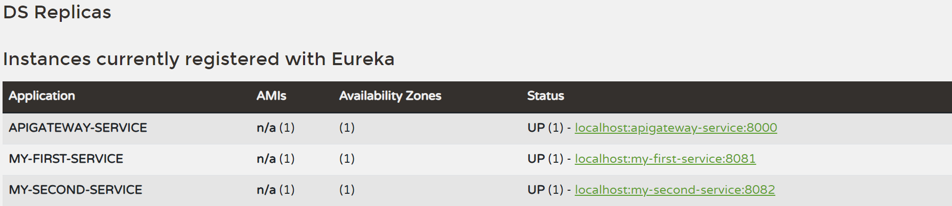 그 후 DiscoveryServer와 다른 모든 서비스들을 구동하면, 브라우저의 대시보드에서 다음과 같은 내용을 확인할 수 있다.