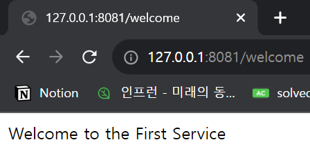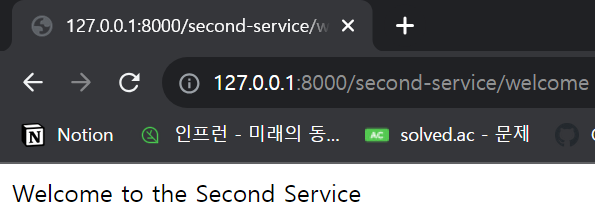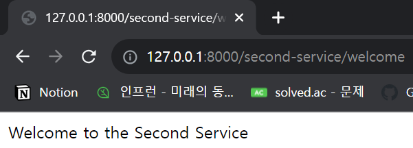 구동 후 브라우저에서 다음과 같이 8000 포트의 조건을 만족하는 Path로 접속하면, 위에서 설정한 대로 FIRST-SERVICE와 SECOND-SERVICE가 나타남을 확인할 수 있다.
