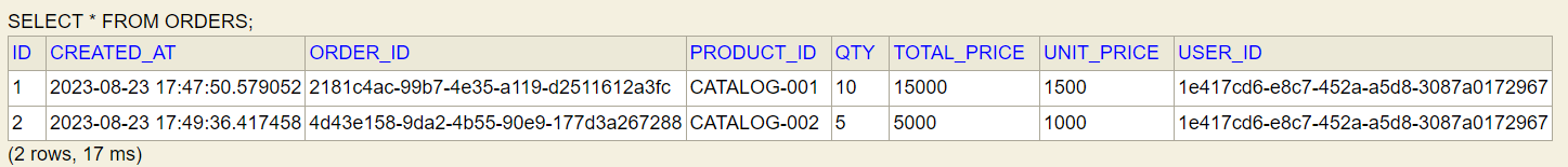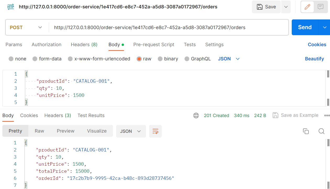 모든 서비스를 구동하고, user를 등록한 후에 회원 정보를 사용해 다음과 같이 order를 등록해 보자.