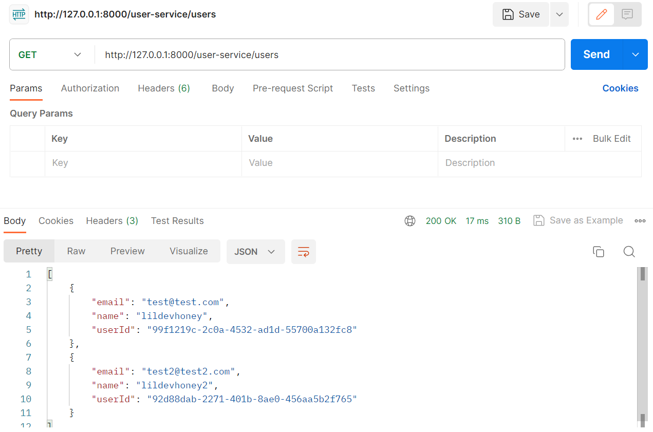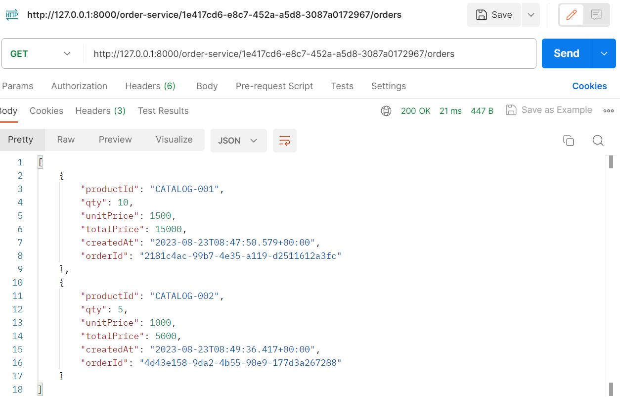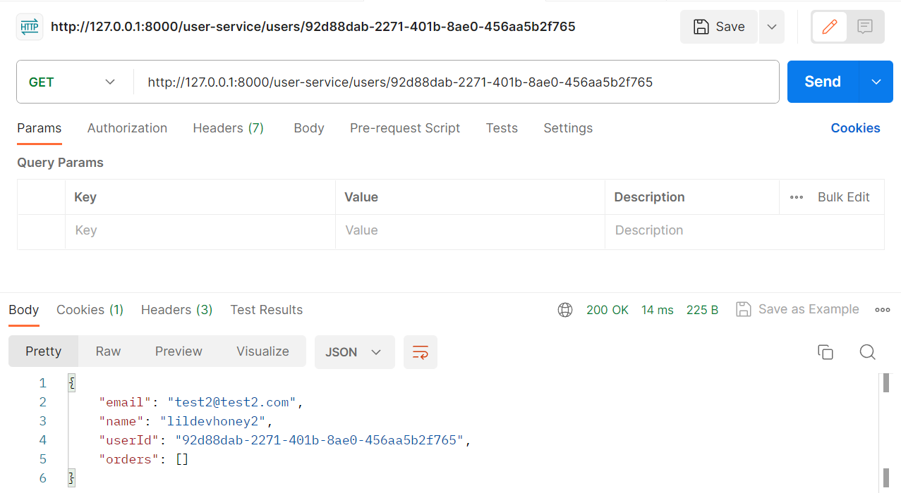 개별 사용자 상세 정보 확인 API도 잘 작동함을 확인할 수 있다. orders의 경우 아직 주문 서비스는 구현하지 않았기에 비어있는 것이다.