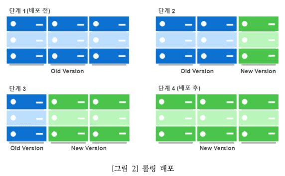 먼저 롤링 배포이다. 현재 사용 중인 이전 버전의 인스턴스들을 천천히 하나씩 업그레이드하여 최종적으로 모든 인스턴스에서 새로운 버전을 배포하도록 만드는 방법이다. 당연히 특정 인스턴스에서 배포를 진행하는 도중에는 그 인스턴스로 로드밸런서가 라우팅하지 않도록 하는 작업이 필요할 것이다.
