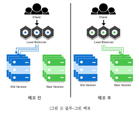 블루-그린 배포는 이전 버전을 나타내는 블루 버전과 새로운 버전을 나타내는 그린 버전에서 이름을 따왔으며, 운영 환경에 이전 버전의 인스턴스와 동일한 새로운 버전의 인스턴스들을 구성한 후에 로드밸런서로 트래픽을 새로운 버전의 인스턴스로 한번에 전환하는 방법이다.