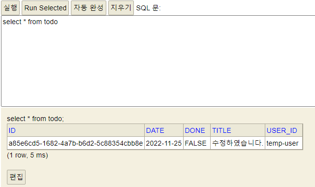 H2에서 select문을 사용해 입력한 ToDo가 DB에 저장되었는지 확인할 수 있다.