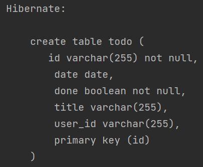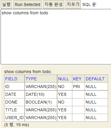 H2에서 show문을 사용해 Todo 테이블의 column들을 확인하였을 때, 역시 의도한 대로 잘 생성됐음을 확인할 수 있다.