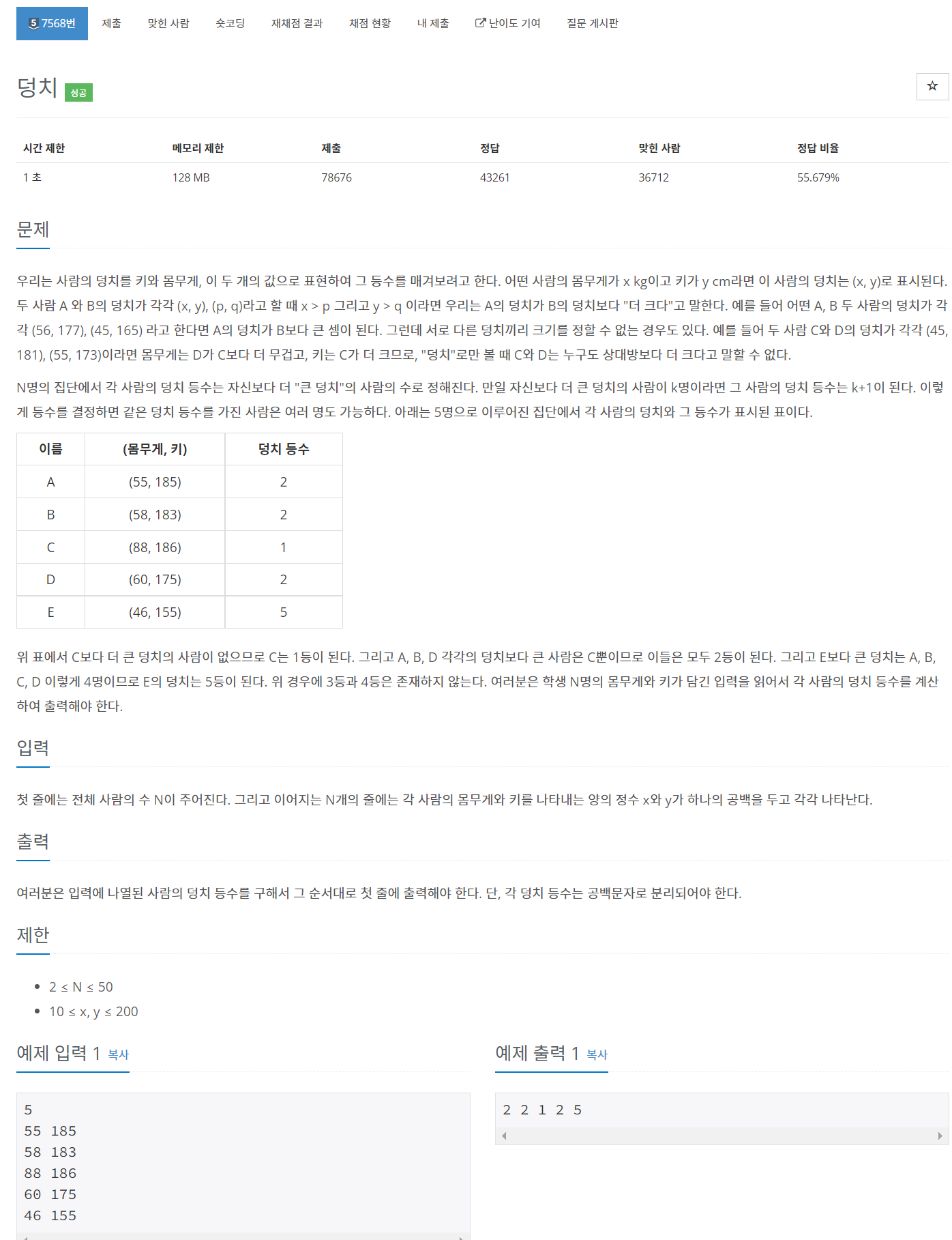 문제 링크 : https://www.acmicpc.net/problem/7568