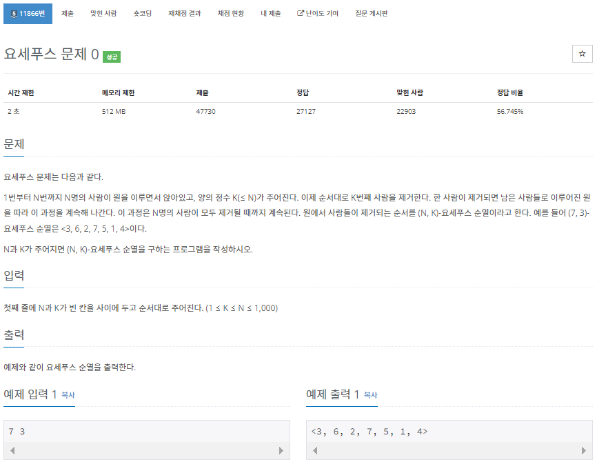 문제 링크 : https://www.acmicpc.net/problem/11866