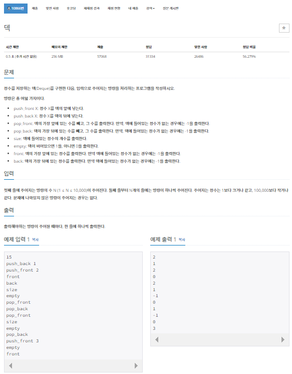 Deque의 다양한 메서드들을 구현하는 문제이다. 파이썬의 deque와 sys.stdin.readline()을 통해 시간제한 안에서 여유롭게 통과할 수 있다. 실버 4 문제라기엔 파이썬 코더에겐 상당히 쉬운 문제라고 할 수 있다.