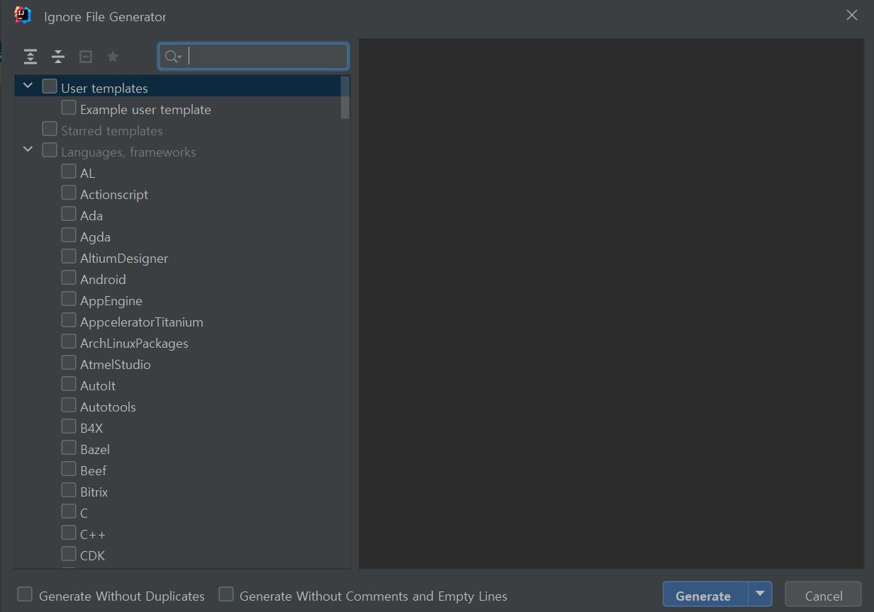Generate 버튼을 누르면, .gitignore 파일이 생성되고 생성된 파일에 다음과 같이 입력한다.