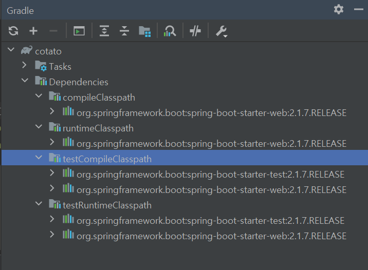 dependencies { // spring-boot-gradle-plugin라는 스프링 부트 그레이들 플러그인의 2.1.7.RELEASE를 의존성으로 받겠다.