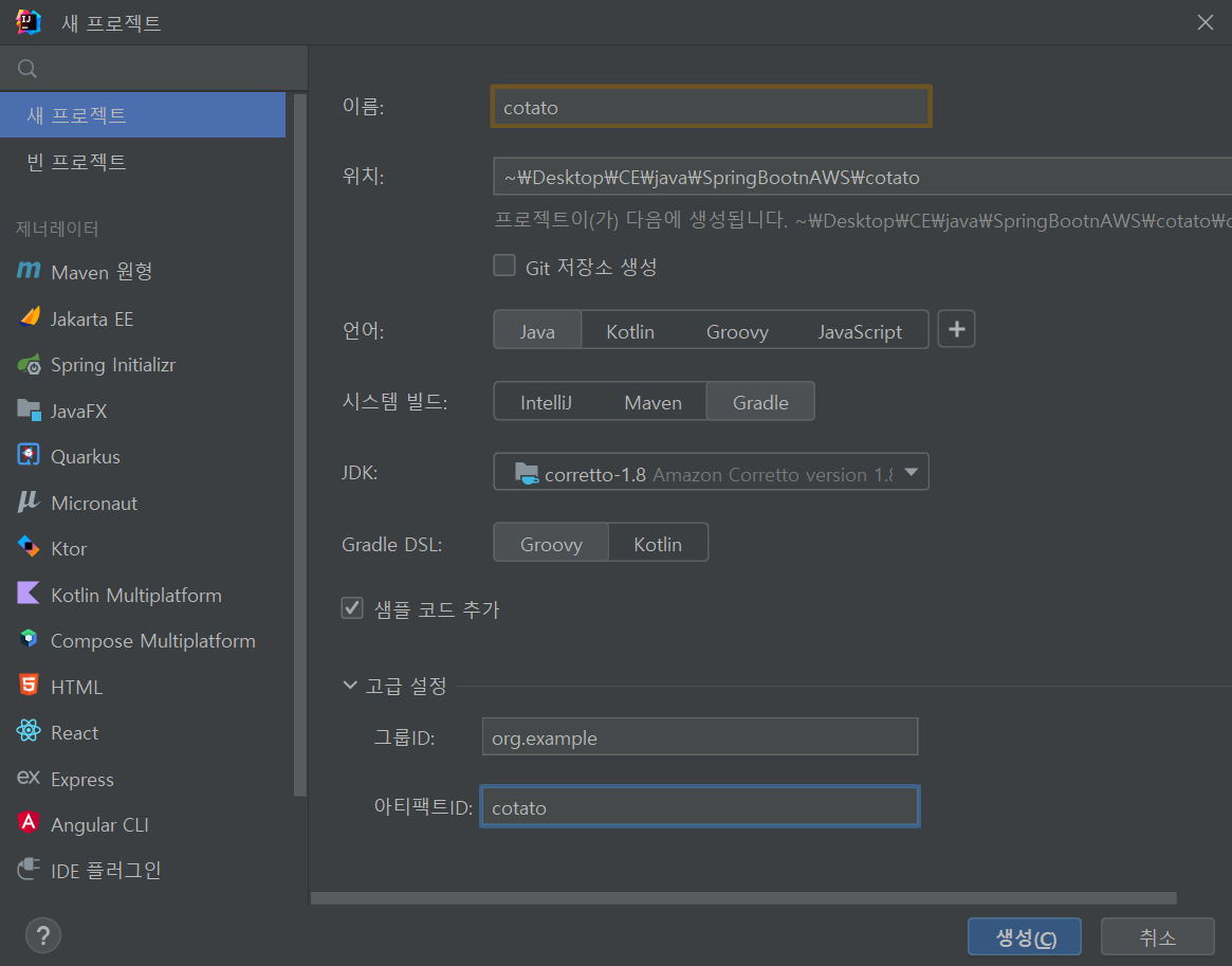 인텔리제이 커뮤니티가 아닌 인텔리제이 얼티메이트라 그런지 책에 나온 방법과는 다르게 아래와 같은 방법으로 Gradle 프로젝트를 생성하였다.