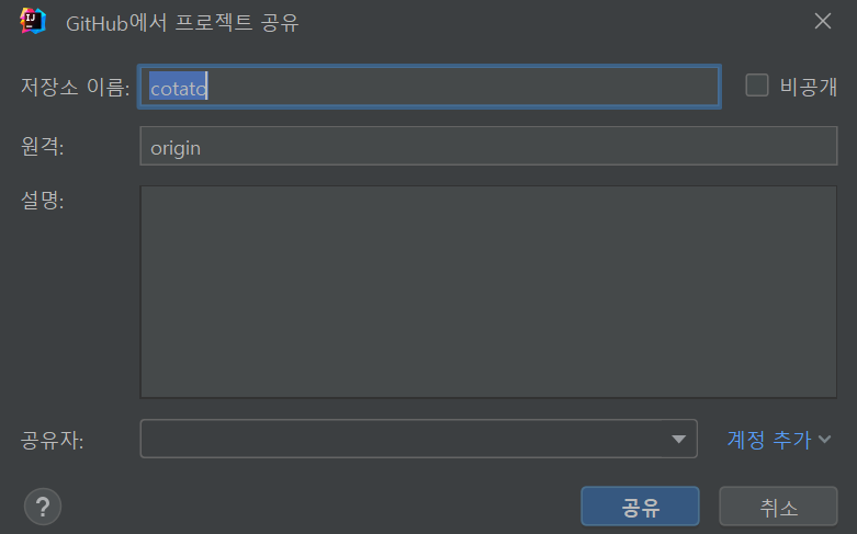 이름과 설명을 추가하고, 공유 버튼을 클릭하면 다음과 같이 커밋창이 나오는데