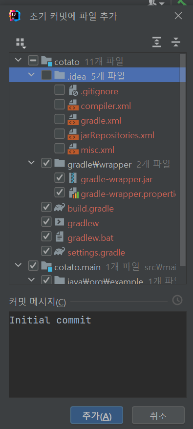 위와 같이 설정함으로써 앞으로의 모든 커밋 대상에서 gradle 디렉토리와 idea 디렉토리는 제외된다.