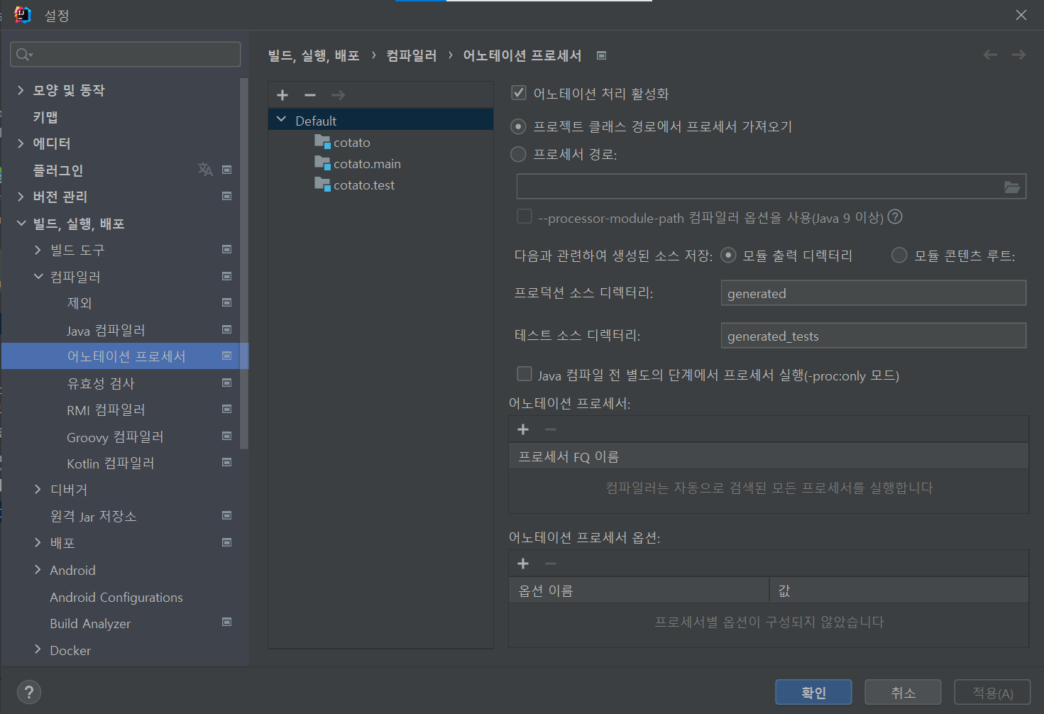 플러그인 설치 후 IntelliJ IDE를 재실행하고, [파일] > [설정] > [빌드, 실행, 배포] > [컴파일러] > [어노테이션 프로세서]에서 어노테이션 활성화 체크 박스를 체크한다.