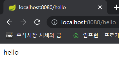 이 프로젝트는 /hello로 GET 요청이 들어오면 문자열 'hello'를 반환하고 화면에 띄워주는 기능을 가지게 되었다.