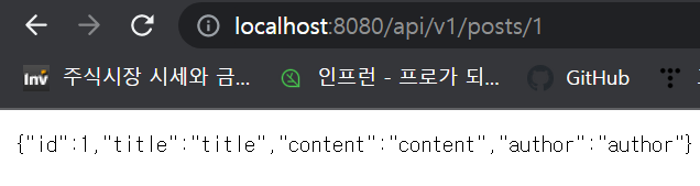 브라우저에 http://localhost:8080/api/v1/posts/1을 입력해 API 조회 기능을 테스트해 보자.