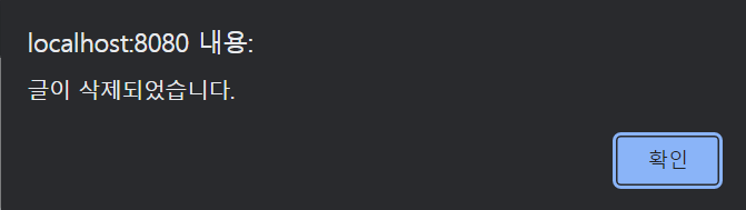 다음과 같이 삭제 성공 메시지와 기존 게시글이 목록에서 삭제되었음을 확인할 수 있다.