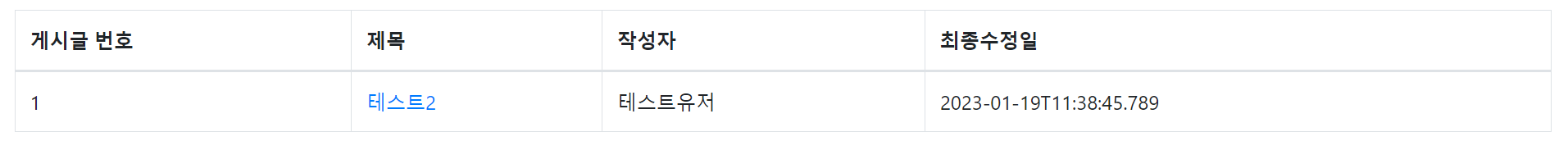 수정 완료 버튼을 누르면 수정 완료 메시지가 나타나며, 제목이 테스트2로 잘 변경됨을 확인할 수 있다.