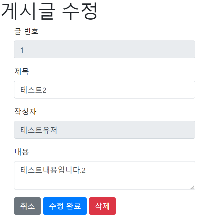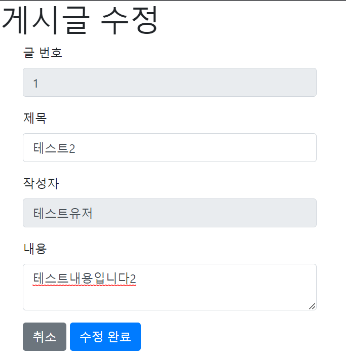 이렇게 게시글 수정을 위한 모든 구성을 마쳤다. 수정 기능을 한 번 사용해 보자.