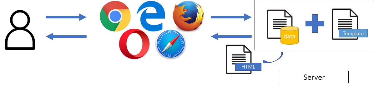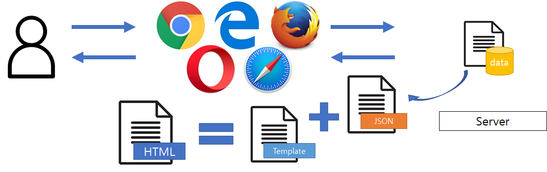 반면에 클라이언트 템플릿 엔진은 서버 템플릿과 마찬가지로 지정된 템플릿 양식과 데이터가 합쳐져 HTML 문서를 출력하지만 브라우저 위에서 작동한다. 즉, 브라우저 위에서 작동하기 때문에 서버 템플릿 엔진에서 제어할 수가 없다. 그렇기 때문에 서버에서 Json, Xml 형식의 데이터만 전달해 주고 클라이언트에서 코드와 조립한다.