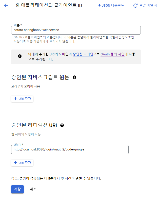 동의 화면 구성을 마쳤다면 화면 제일 아래에 저장 버튼을 클릭한 후, OAuth 클라이언트 ID 만들기 화면으로 바로 이동한다.