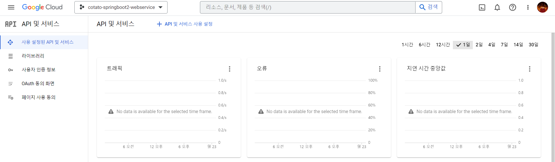 로그인과 결제 등록 후, 새 프로젝트를 생성 후 다음과 같이 API 및 서비스 대시보드로 접속한다.