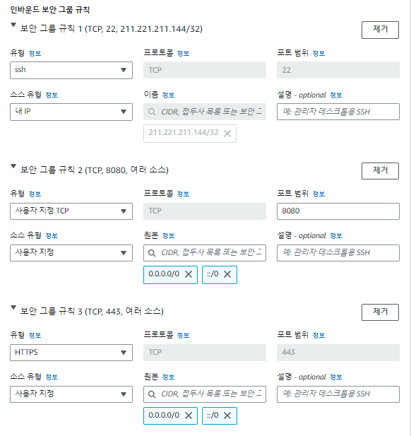 보안은 언제나 높을수록 좋으므로 pem 키 관리와 지정된 IP에서만 ssh 접속이 가능하도록 구성하는 것이 안전하다. 그래서 일단 현재 IP를 기본적으로 추가하고, 다른 장소에서 접속할 때 다시 SSH 규칙에 추가하는 것이 안전하다.
