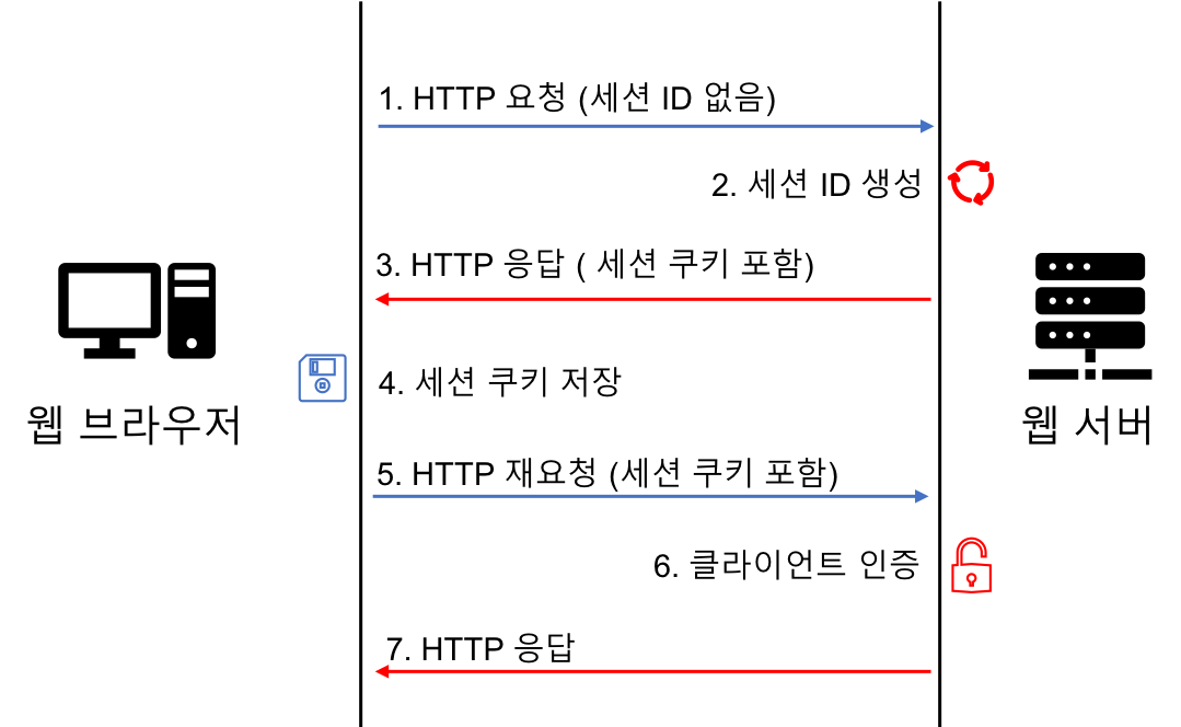 3. 클라이언트는 응답에서 받은 세션 쿠키(세션 ID 값)를 저장해두고, 매번 해당 서버에 요청을 보낼 때마다 세션 쿠키를 함께 보내서 자신이 누구인지 인증한다.