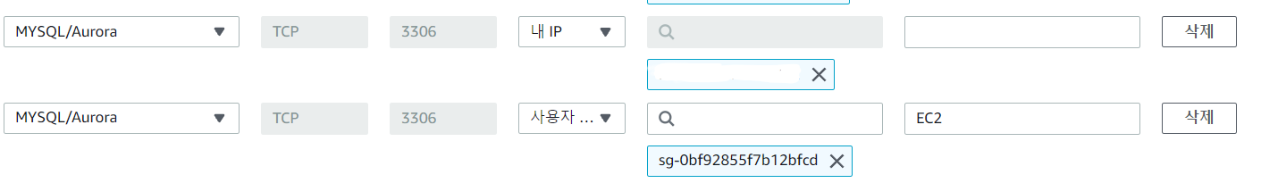 보안 그룹의 첫 번째 줄에는 현재 내 PC의 IP, 두 번째 줄에는 EC2의 보안 그룹을 추가한다. 이렇게 함으로써 EC2와 RDS 간의 접근이 가능해진다.