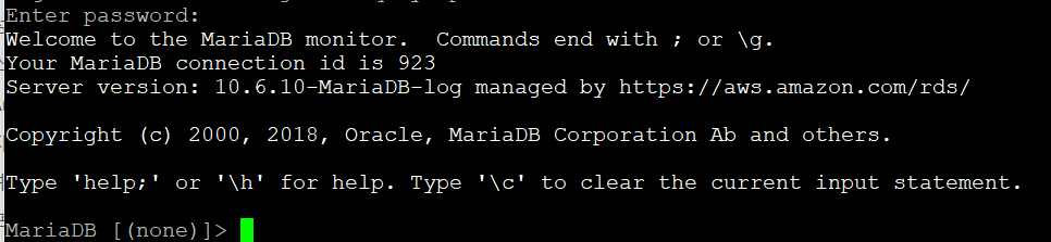 비밀번호까지 입력을 해주면 아래 그림처럼 EC2에서 RDS로 접속이 완료됨을 확인할 수 있다.