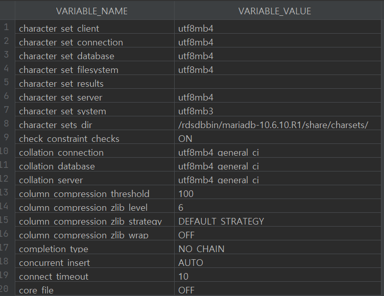 이를 실행해 보면 character_set_database, collation_database를 제외하고 utf8mb4로 잘 적용되었음을 확인할 수 있다.