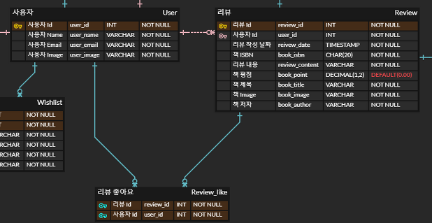 review_id는 리뷰 테이블에서 참조하여 받아오는 외래키이고, 마찬가지로 user_id도 사용자 테이블에서 받아오는 외래키이다.