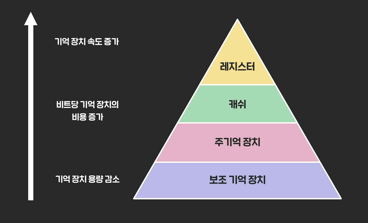 일반적으로 메모리 계층 구조는 CPU 내부에 존재하는 레지스터(Register), CPU가 빠르게 접근할 수 있는 캐시 메모리(Cache Memory), 그다음으로 느리지만 큰 용량을 가지는 메인 메모리(Main Memory), 더 느리지만 매우 큰 저장 용량을 가지는 보조 기억장치(Secondary Storage)로 구성된다.