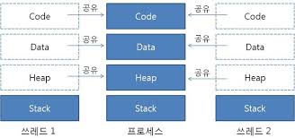 스레드는 공유 메모리를 이용하여 데이터를 주고받는다. 공유 메모리는 여러 스레드에 의해 동시에 접근 가능한 메모리 영역으로 Code, Data, Heap으로 이루어진다. (프로세스의 Code, Data, Heap이다.)